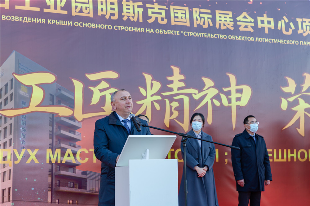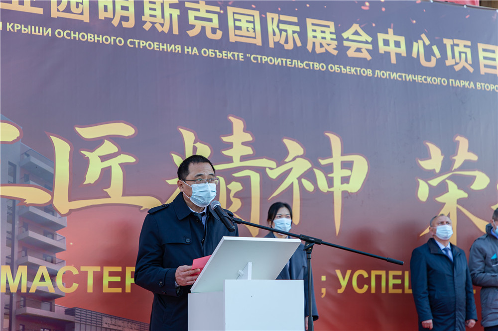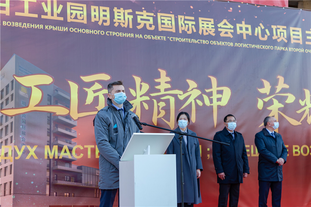 亞羅申科主任在致辭中表示,2019年以來,園區(qū)承辦了諸如“一帶一路”區(qū)域發(fā)展論壇、白俄羅斯農(nóng)機展、世界技能大賽等大型活動,相信展會中心項目落成后,將進(jìn)一步提高園區(qū)的服務(wù)配套能力,更好的服務(wù)園區(qū)的發(fā)展??_杰耶夫第一副總經(jīng)理向項目順利封頂表示祝賀,他表示該項目的設(shè)計工作是由中白雙方設(shè)計院共同合作完成,園區(qū)開發(fā)公司首次參與了園區(qū)居民企業(yè)項目的監(jiān)理工作,充分體現(xiàn)了中白兩國企業(yè)的合作精神,希望該項目早日竣工并服務(wù)于園區(qū)的發(fā)展。