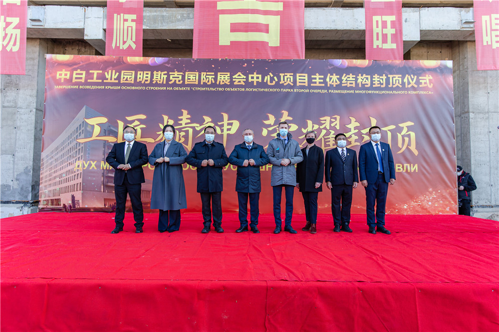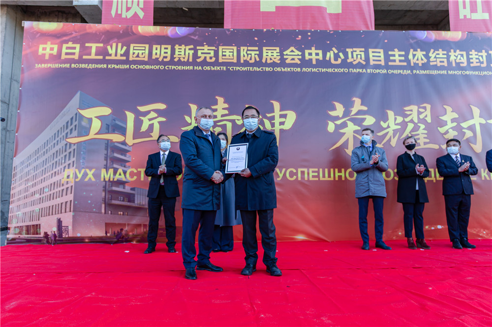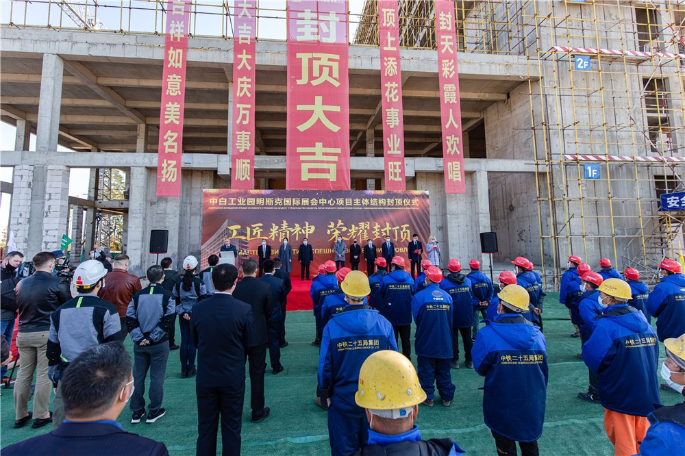2021年國慶期間,由招商蛇口、成都興城聯(lián)合投資,中鐵二十五局集團(tuán)有限公司承建的中白工業(yè)園明斯克國際展會中心項目順利封頂,中白工業(yè)園管委會主任亞羅申科,中白工業(yè)園開發(fā)公司第一副總經(jīng)理卡羅杰耶夫,招商興城國際展會中心有限公司總經(jīng)理陳偉、中鐵二十五局項目經(jīng)理戶曉飛等領(lǐng)導(dǎo)出席封頂儀式并致辭,亞羅申科主任宣布項目主體結(jié)構(gòu)封頂,并為投資方頒發(fā)園區(qū)特別貢獻(xiàn)獎,以表彰本項目優(yōu)異的施工進(jìn)度、安全文明及質(zhì)量管理。
