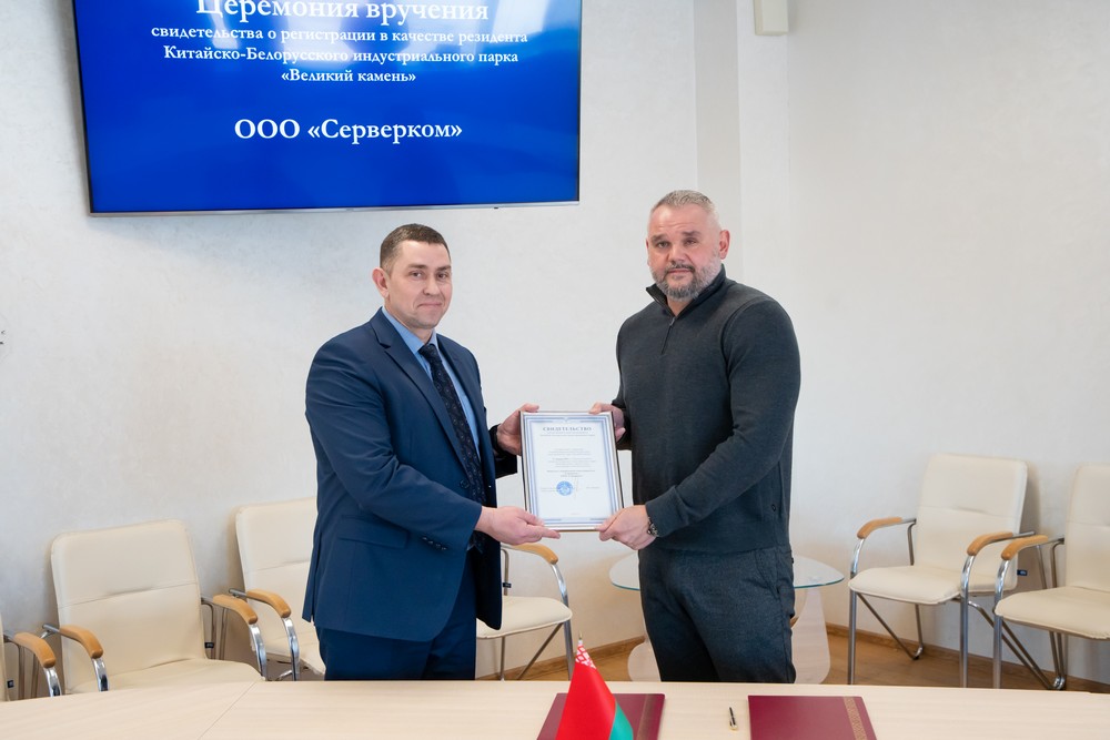 1月17日,服務器通訊有限責任公司成為中白工業(yè)園居民企業(yè),管委會第一副主任亞季莫夫與該公司總經(jīng)理聶奇米烈夫簽署入園協(xié)議,并頒發(fā)了入園證書,副主任塔巴紐霍夫、副主任日佳洛、開發(fā)公司第一副總經(jīng)理卡羅捷耶夫參與儀式。