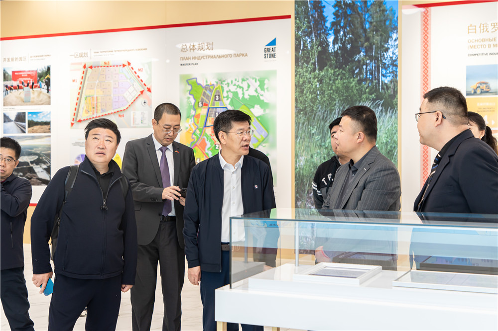 在園區(qū)規(guī)劃館,園區(qū)開發(fā)公司副總經(jīng)理任飛詳細(xì)介紹了園區(qū)的管理架構(gòu)、規(guī)劃布局、優(yōu)惠政策和招商引資等內(nèi)容,并介紹了園區(qū)居民企業(yè)向北國(guó)際物流有限公司的相關(guān)情況。黃志強(qiáng)常務(wù)副主席對(duì)園區(qū)的發(fā)展表示肯定,并表示,內(nèi)蒙古將繼續(xù)研究和支持更多企業(yè)在入駐中白工業(yè)園、中歐班列、公路運(yùn)輸?shù)陌l(fā)展,共同推動(dòng)“一帶一路”的發(fā)展。黃志強(qiáng)常務(wù)副主席一行還考察了國(guó)機(jī)火炬園、招商局商貿(mào)物流園等居民企業(yè)項(xiàng)目。