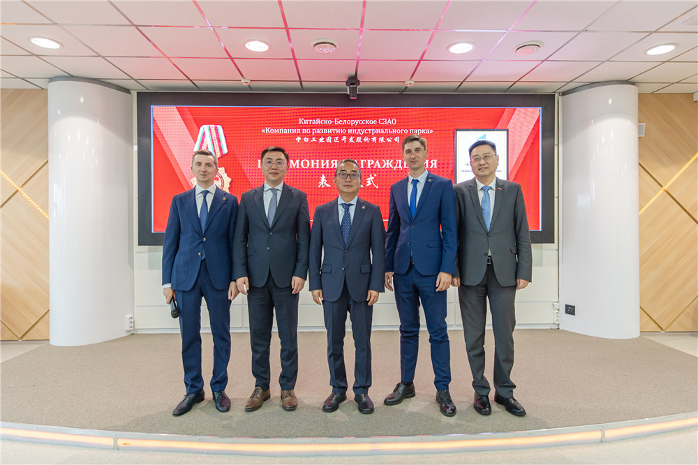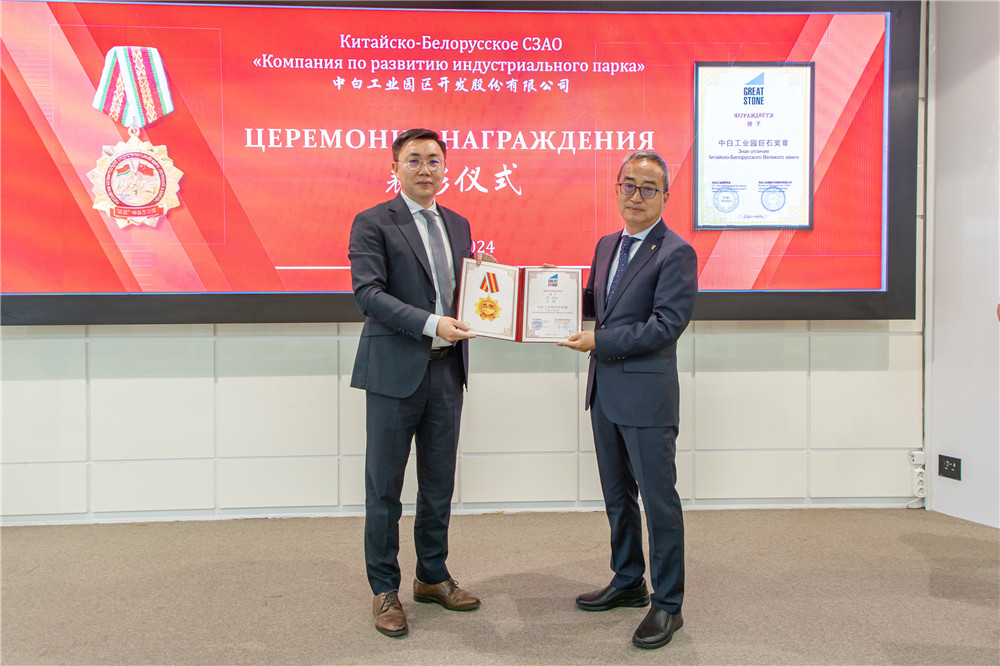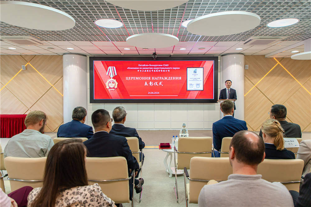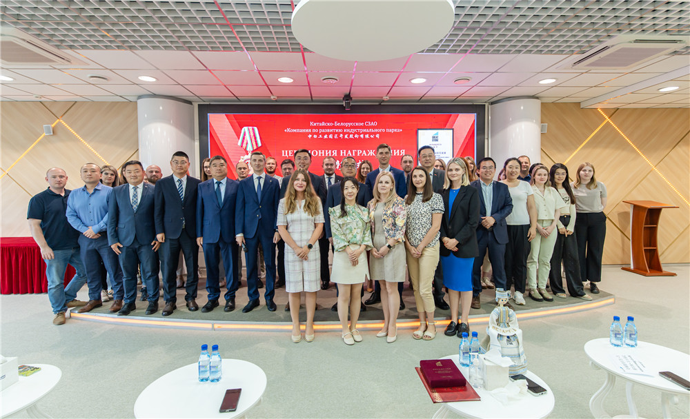 2024年6月24日,中白工業(yè)園巨石獎?wù)骂C授儀式在園區(qū)舉行,園區(qū)開發(fā)公司總經(jīng)理李鐘漢向即將離任的公司副總經(jīng)理吳鵬頒授巨石獎?wù)潞妥C書,園區(qū)開發(fā)公司第一副總經(jīng)理卡羅捷耶夫主持活動,開發(fā)公司副總經(jīng)理任飛、副總經(jīng)理杰特科夫等領(lǐng)導(dǎo)參加活動。
