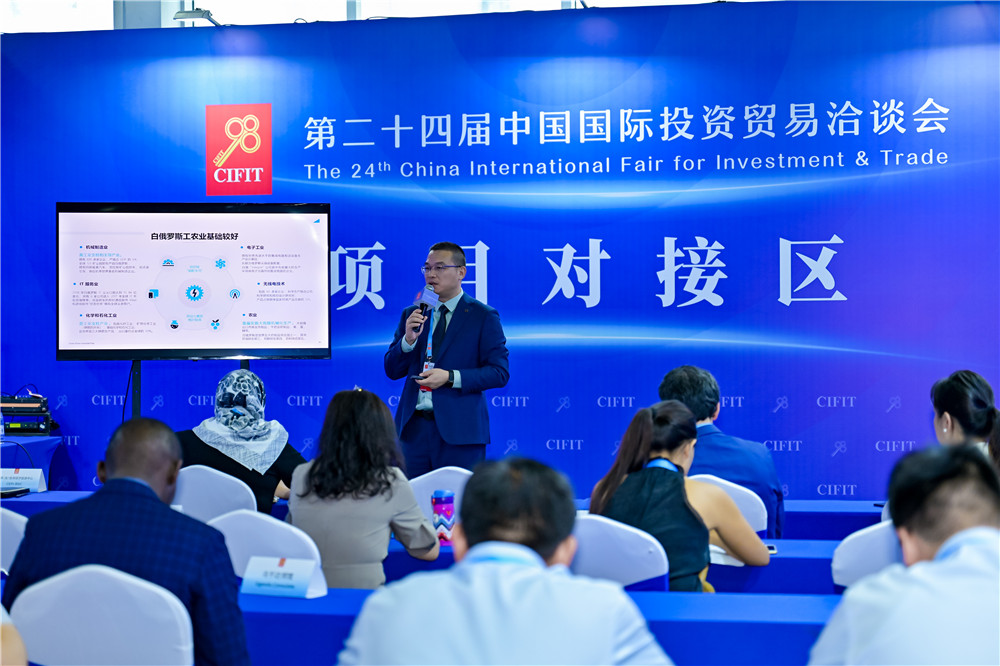 9月8日下午,中白工業(yè)園參加第二十四屆投洽會“走出去”系列活動之金磚+投資項目對接會。埃及、伊朗、烏干達(dá)、烏茲別克、巴西等國家招商投促機(jī)構(gòu),中國投資企業(yè)、貿(mào)易機(jī)構(gòu)等50余人參加活動。中白工業(yè)園在活動上做主題推介,會后與參會企業(yè)進(jìn)行交流。