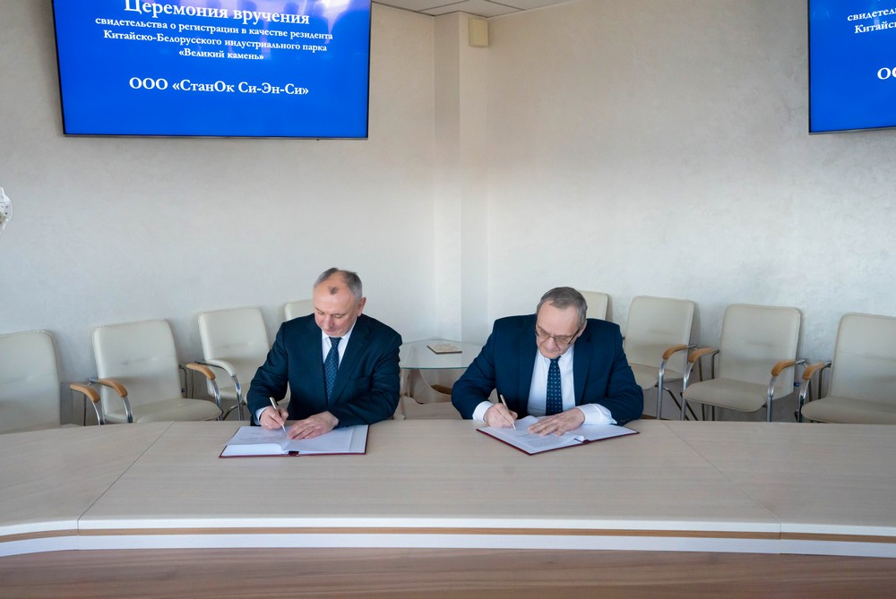 2025 年1月30日, “CNC機(jī)床”有限公司(ООО ?СтанОк Си-Эн-Си?)和“替代能源與技術(shù)科研中心”有限公司(ООО ?Научно-исследовательский центр альтернативной энергетики и технологий?)入駐中白工業(yè)園,成為園區(qū)居民企業(yè)。園區(qū)管委會主任亞羅申科分別向兩家公司負(fù)責(zé)人頒發(fā)居民企業(yè)證書。