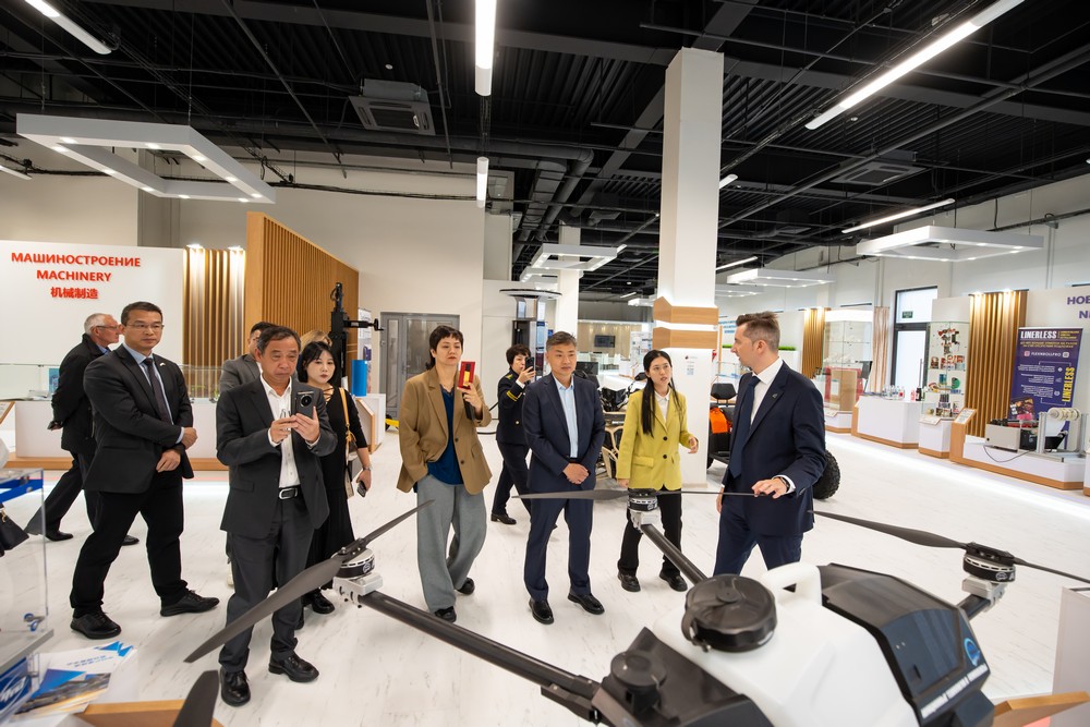 5月27日,世界中醫(yī)藥學(xué)會聯(lián)合會一技之長專業(yè)委員會秘書長董建國率領(lǐng)中國中醫(yī)藥代表團(tuán)訪問中白工業(yè)園。中白工業(yè)園區(qū)開發(fā)公司第一副總經(jīng)理卡羅杰耶夫陪同考察??_杰...202505-27