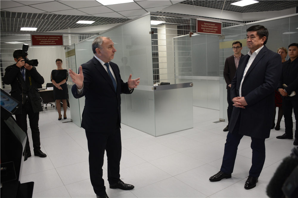 在管委會“一站式”服務(wù)大廳,亞羅申科向阿布爾加濟(jì)耶夫總理介紹了管委會為居民企業(yè)提供一站式服務(wù)的相關(guān)內(nèi)容,并闡述了中白工業(yè)園管委會在學(xué)習(xí)中國園區(qū)開發(fā)經(jīng)驗時的做法。