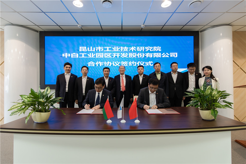 2019年6月14日上午,中白工業(yè)園區(qū)開發(fā)公司CEO胡政在綜合辦公樓會見昆山市委書記杜小剛,并共同見證開發(fā)公司副總經(jīng)理任飛與昆山市工業(yè)技術(shù)研究院(下稱“工研院”)總經(jīng)理浦景松簽署合作協(xié)議。合作協(xié)議的簽署旨在推動園區(qū)與工研院在小核算生物醫(yī)藥、機器人及精密裝備制造等方面的合作。