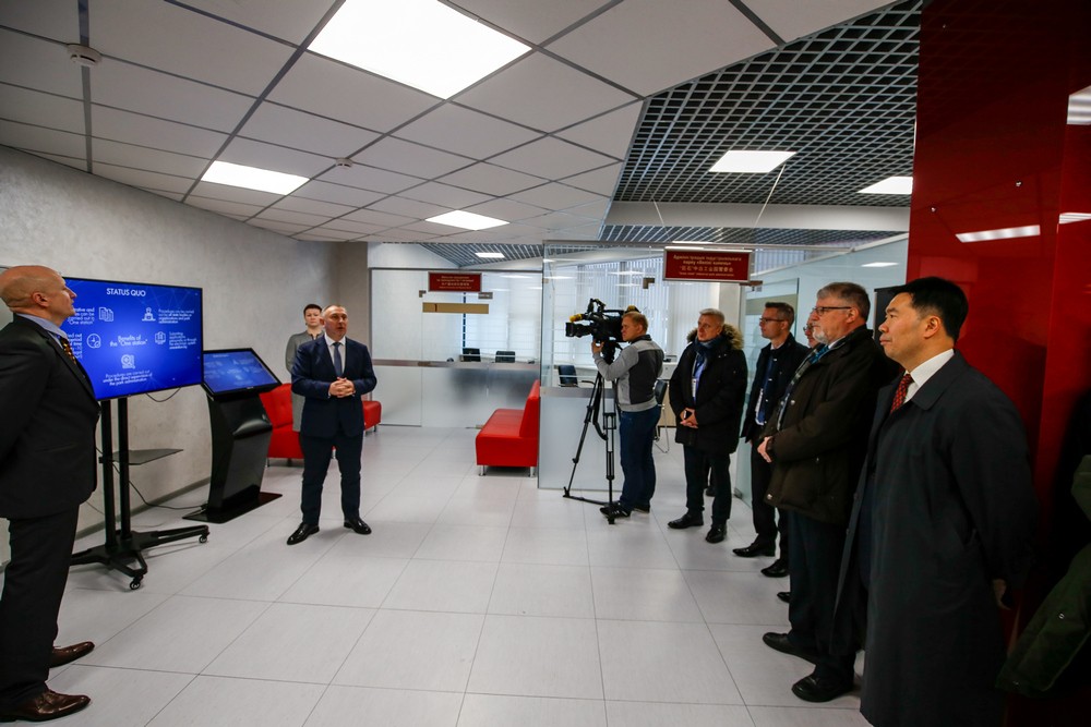 冬日園區(qū),雙喜臨門。2019年11月26日,中白工業(yè)園B1標準廠房落成儀式暨第60家居民企業(yè)入園儀式在園區(qū)隆重舉行,白俄羅斯共和國第一副總理圖爾欽、園區(qū)管委會主任亞羅申科、開發(fā)公司總經(jīng)理嚴剛等領導共同為園區(qū)B1標準廠房落成剪彩。隨后,亞羅申科向第60家居民企業(yè)赫斯巨石有限責任公司經(jīng)理維德梅爾頒發(fā)了入園證書。