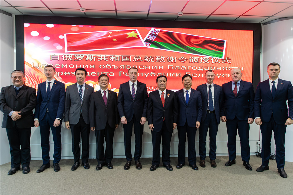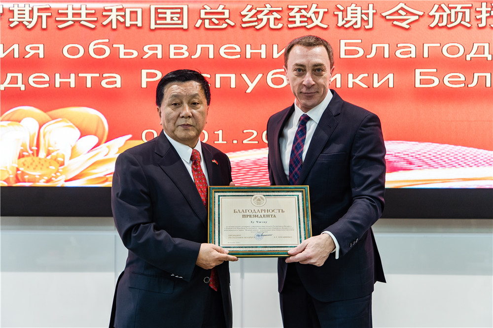 2020年1月3日上午,白俄羅斯總統(tǒng)盧卡申科給胡政的致謝令頒授儀式在中白工業(yè)園隆重舉行。白俄羅斯總統(tǒng)辦公廳副主任、中白政府間合作委員會白方主席斯諾普科夫親臨中白工業(yè)園開發(fā)公司,代表白俄羅斯政府宣讀并頒發(fā)了盧卡申科總統(tǒng)關(guān)于向退休離任回國的中白工業(yè)園CEO胡政致謝的命令。中國駐白俄羅斯大使崔啟明、使館政務(wù)參贊羅占輝、經(jīng)濟(jì)商務(wù)參贊楊修敏、集團(tuán)駐白俄羅斯代表處副首席代表、中白工業(yè)園開發(fā)公司總經(jīng)理嚴(yán)剛等出席此次儀式。
