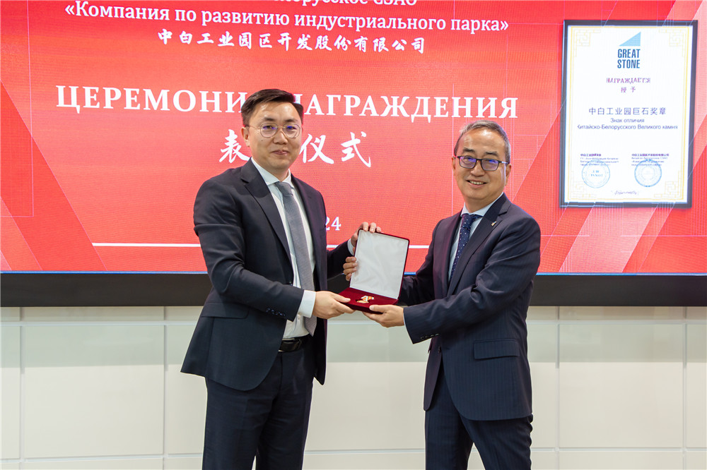 2024年6月24日,中白工業(yè)園巨石獎(jiǎng)?wù)骂C授儀式在園區(qū)舉行,園區(qū)開(kāi)發(fā)公司總經(jīng)理李鐘漢向即將離任的公司副總經(jīng)理吳鵬頒授巨石獎(jiǎng)?wù)潞妥C書,園區(qū)開(kāi)發(fā)公司第一副總經(jīng)理卡羅...202406-24